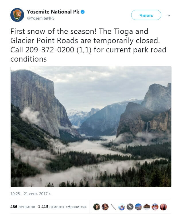 Снег покрыл вершины Национального парка Йосемити и временно закрыл дорогу Тиога-Пасс, которая обычно не перекрывается до середины ноября.