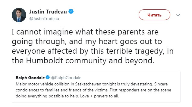 «Не могу даже представить себе, что сейчас переживают родители. Все мои мысли и чувства обращены сейчас ко всем, кого коснулась эта трагедия — как в общине Гумбольдта, так и за ее пределами», — говорится в его Twitter.