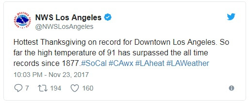В четверг, 23 ноября, в Южной Калифорнии был самый жаркий День благодарения, а в центре Лос-Анджелеса – 33 градуса по Цельсию. Учитывая, что регистрация температурного режима ведется с 1877 года, в этом году праздник стал самым жарким за всю историю, сообщила Национальная метеорологическая служба.