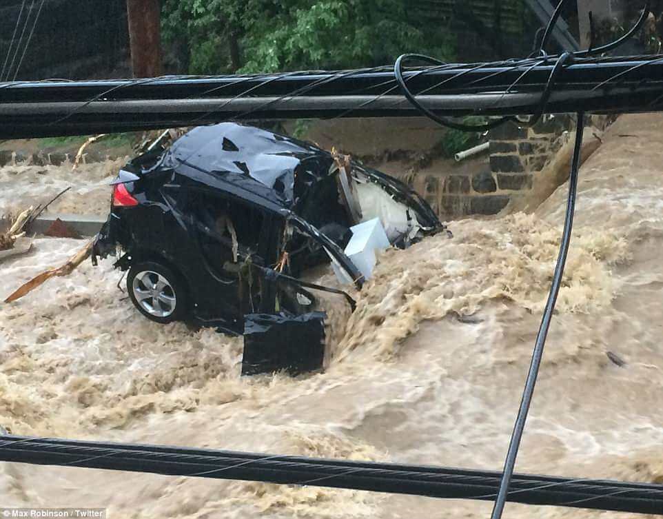 Грязная вода пронеслась главной улицей Элликкота, поднимая автомобили, после того как близлежащая река Патапско поднялась до рекордного уровня.