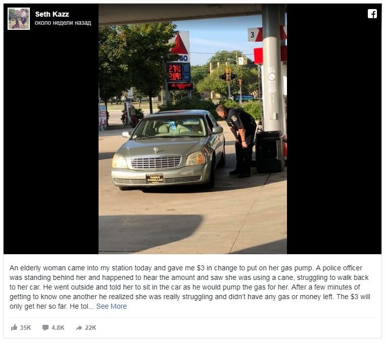 Этот акт доброты был снят на камеру владельцем заправки, Сет Казз, который разместил пост на Facebook.
