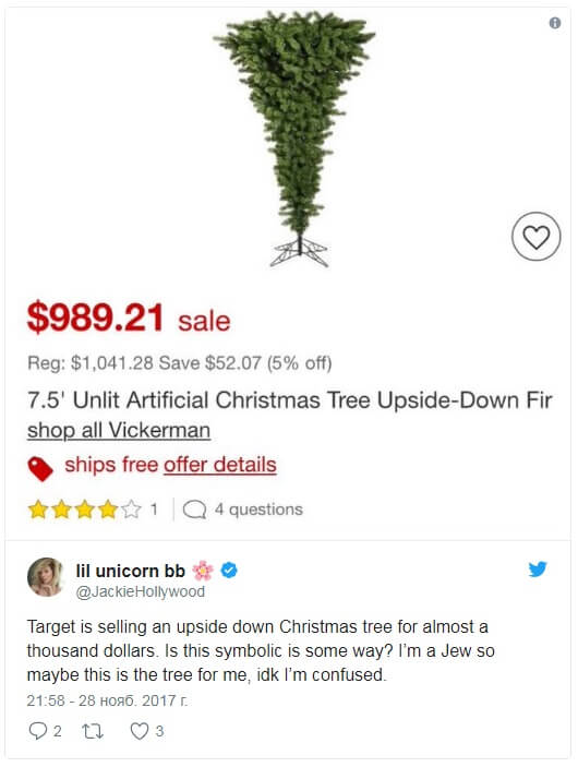 Искусственные елки можно купить в Walmart за $250. В Kohl можно купить перевернутую елку высотой 2 метра за $450, а в Target ель аналогичного размера продают чуть больше чем за $1000. Самое дешевое дерево высотой 2 метра можно купить в Home Depot за $160.