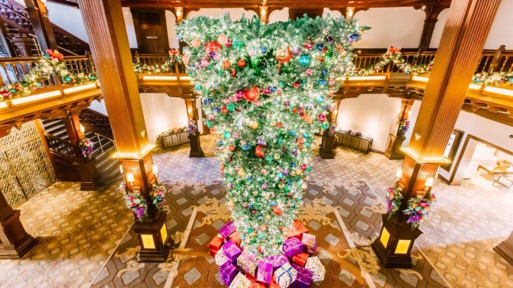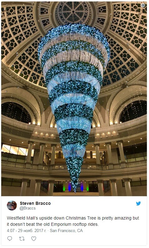 В США становятся популярными перевернутые рождественские елки, которые очень часто можно встретить в отелях и универмагах.