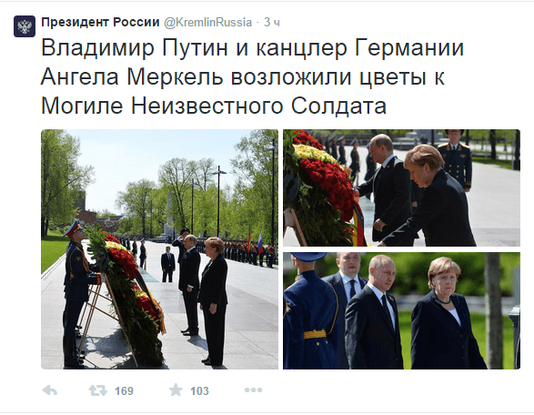 Меркель, как и многие другие мировые лидеры, отказалась приезжать в Москву на парад в честь Дня Победы, однако предложила Путину 10 мая вместе отдать дань погибшим в Великой Отечественной войне.