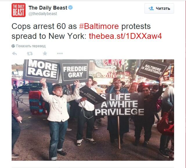 В Нью-Йорке арестованы более 100 человек, которые приняли участие в демонстрации солидарности с жителями Балтимора, где прошли массовые беспорядки после гибели 25-летнего афроамериканца Фредди Грея, задержанного полицией. Участники акции на Манхэттене перекрывали дороги и вступали в стычки с полицейскими.