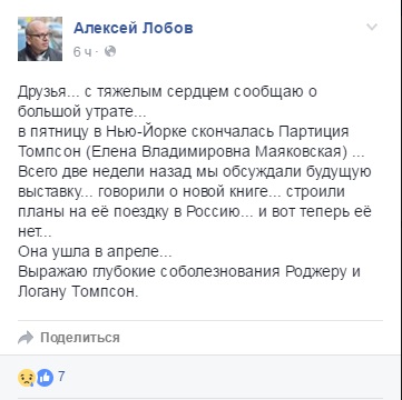 «В Нью-Йорке скончалась Партиция Томпсон (Елена Владимировна Маяковская)», — сообщил на своей странице в «Фейсбуке» директор Государственного музея Маяковского Алексей Лобов.