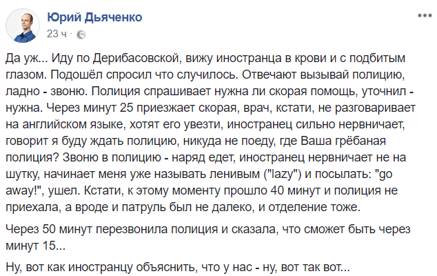 «Да уж… Иду по Дерибасовской, вижу иностранца в крови и с подбитым глазом. Подошёл спросил что случилось. Отвечают вызывай полицию, ладно — звоню. Полиция спрашивает, нужна ли скорая помощь, уточнил — нужна. Через минут 25 приезжает скорая, врач, кстати, не разговаривает на английском языке, хотят его увезти, иностранец сильно нервничает, говорит я буду ждать полицию, никуда не поеду, где Ваша гр.баная полиция?»,- написал Дяченко.
