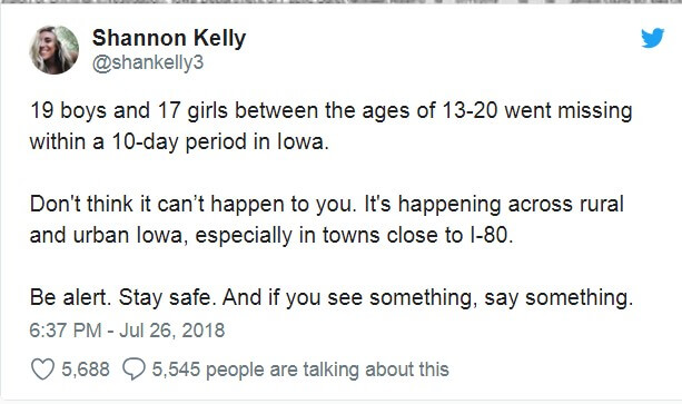 «19 мальчиков и 17 девочек в возрасте от 13 до 20 лет пропали без вести в течение 10 дней в Айове. Не думайте, что это не может случиться с вами. Это происходит в сельской и городской Айове, особенно в городах, близких к I-80. Будьте осторожны. Оставайтесь в безопасности, и если вы что-то видите, сообщите об этом».