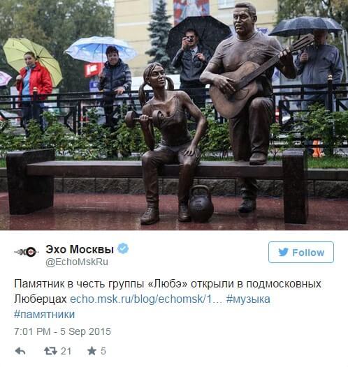 В подмосковных Люберцах установлена скульптурная композиция, посвященная группе «Любэ». Первоначально памятник собирались назвать «Дуся-агрегат», но в итоге название заменили на «Ребята с нашего двора».