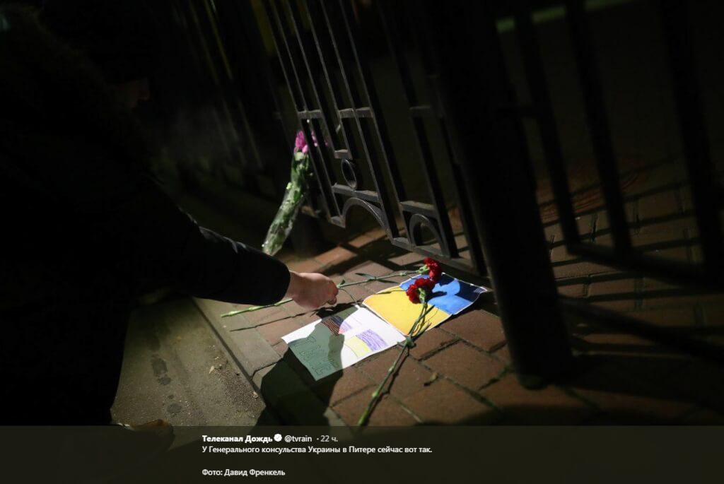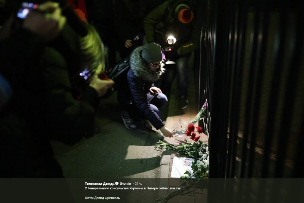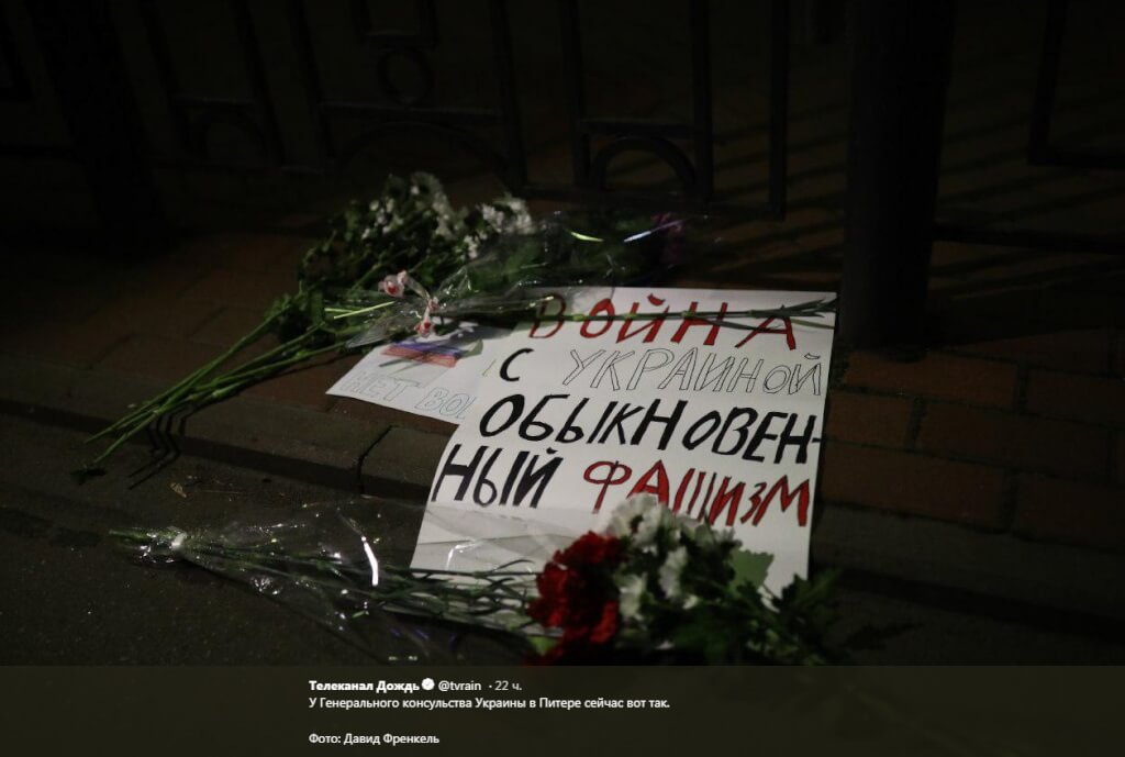 Обычные граждане не должны страдать из-за разногласий политиков!». Жители города принесли цветы к зданию Генконсульства Украины, сообщает телеканал «Дождь».