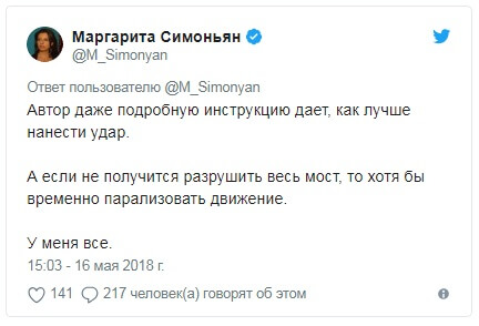 В тексте говорилось, что «Украине стоит разрушить части моста», чтобы послать сигнал от Киева Москве, что украинцы не согласны с «приданием официального характера» краже Путиным территории.