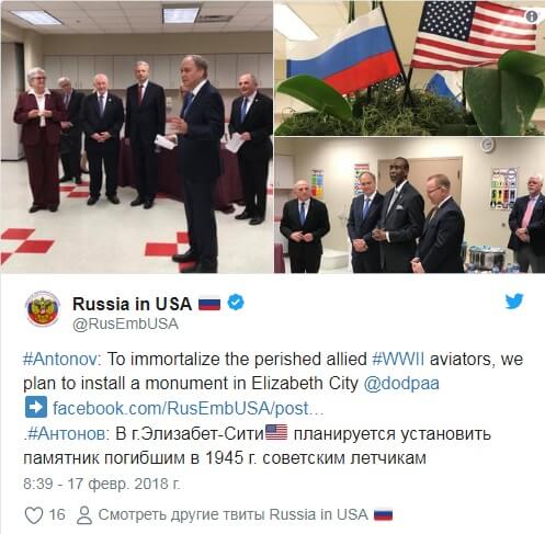 Власти города Элизабет, штат Северная Каролина, отказались устанавливать памятник советским летчикам, погибшим при переправке самолетов-амфибий в СССР во время Второй мировой войны.