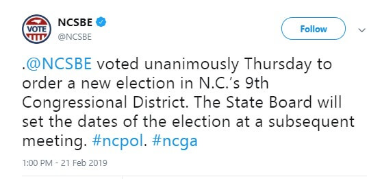 «Избирательная комиссия штата Северная Каролина единогласно проголосовала за то, чтобы назначить проведение новых выборов в Конгресс в 9 округе», — говорится в сообщении. О точной дате выборов сообщат на следующем заседании, пишет RTVi.