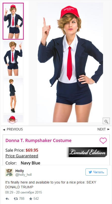 Производитель костюмов для Хеллоуина «Yandy» запустила в продажу костюм Дональда Трампа. Компания превратила образ миллиардера, кандидата в президенты США в «сексуальный» костюм для женщин, пишет Time.