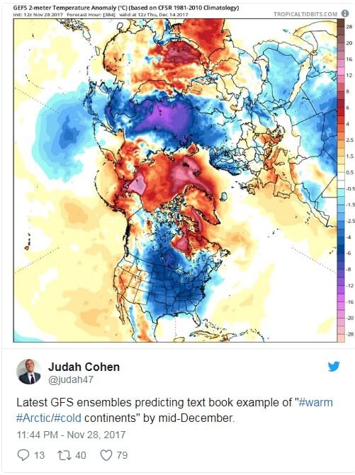 Блокировка высокой широты принесет необыкновенно мягкий воздух для этого времени года в Арктику, что, вероятно, приведет к резкому замедлению роста зимнего морского льда по всему региону.