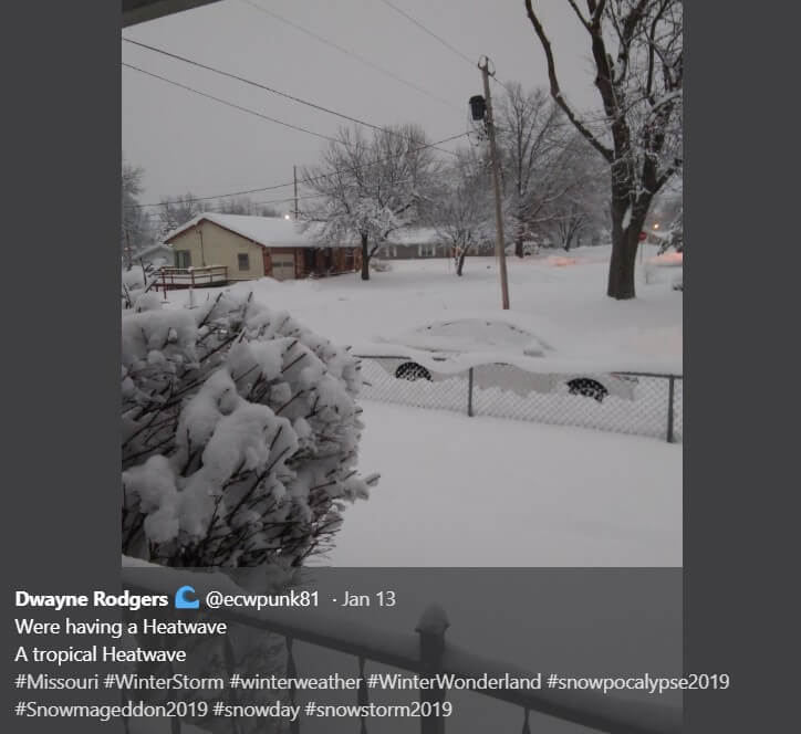 Missouri just got pounded with snow! So glad it finally feels like winter. #snowstorm2019 pic.twitter.com/ImUD0W6HZI