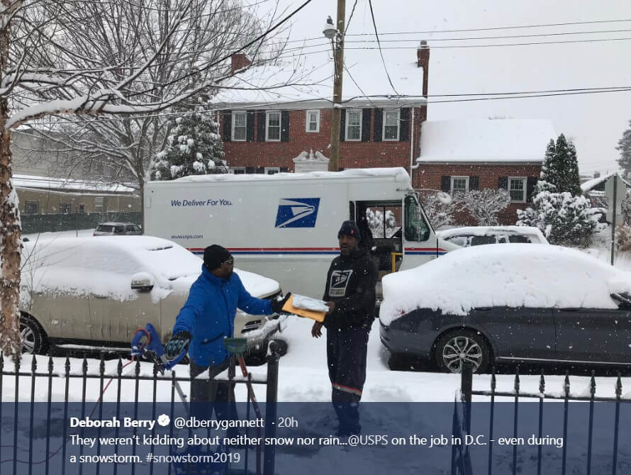 Снег начинался в разных уголках страны с середины до позднего вечера субботы и продолжал идти до утра воскресенья — от 4 до 6 дюймов (10-15 см). Во второй половине воскресенья случился небольшой перерыв, что позволило дорожным бригадам расчистить основные и второстепенные дороги, а людям — откопать свои машины, очистить дорожки и подъездные пути и просто выйти на улицу.