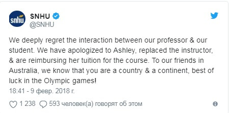 «Мы глубоко сожалеем о взаимодействии нашего профессора и студента. Мы извинились перед Эшли, заменили ее преподавателя и возместили ей оплату за курс. Нашим друзьям в Австралии: мы знаем, что вы и страна, и континент, удачи на Олимпиаде!».