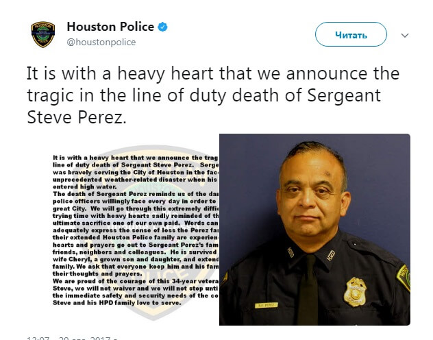 В американском городе Хьюстон в результате наводнения скончался ветеран полиции сержант Стив Перес. 60-летний полицейский проработал в отделе 34 года.