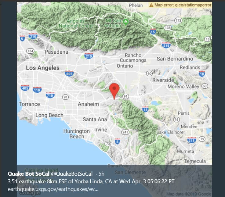 Рано утром в среду, 3 апреля, в южной части Калифорнии произошло землетрясение магнитудой 3,5 балла (по некоторым данным 3,6), затронувшее территории округов Ориндж, Риверсайд и Сан-Бернардино.