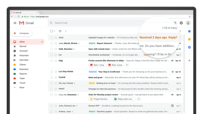 Напоминания о письмах. Если пользователь пропускает письмо, требующее срочных действий или ответа к определённому сроку, Gmail будет напоминать о нём, поднимая его в начало списка входящих. Функция получила название «Подталкивание» (Nudge).