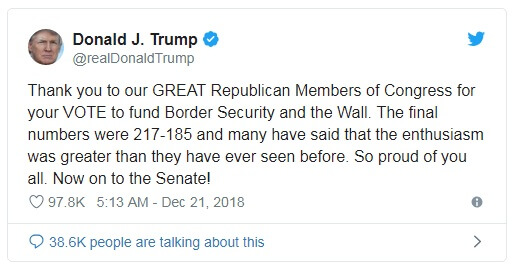 «Спасибо нашим ВЕЛИКИМ конгрессменам-республиканцам за ваше ГОЛОСОВАНИЕ за финансирование пограничной безопасности и стены, — написал он. — Окончательные данные были 217-185, и многие сказали, что энтузиазма было больше, чем когда-либо видели … Теперь в Сенат!».