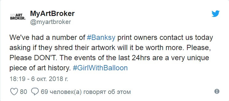 «Несколько владельцев картин Бэнкси связались с нами и спросили, будут ли их работы стоить дороже, если пропустить их через шредер. Пожалуйста, пожалуйста, НЕ НАДО. То, что произошло за последние 24 часа — уникальная часть истории искусства»