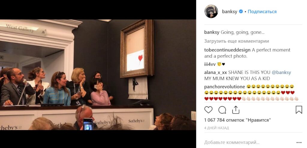 В инстаграме, который считается единственным официальным аккаунтом Бэнкси в соцсетях, появилась фотография с аукциона с комментарием «шло, шло и ушло».