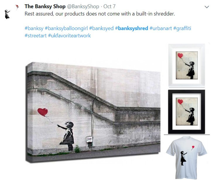 А так шутит магазин, продающий футболки и другую печатную продукцию от Бэнкси (Будьте уверены, наша продукция не поставляется со встроенным шредером):