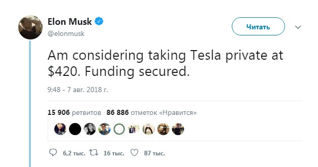 По словам Маска, у компании есть деньги на выкуп акций у инвесторов, однако он не уточнил источник этих денег.