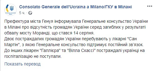 Ранее Департамент консульской службы МИД сообщал, что среди погибших в результате обрушения моста в Генуе граждан Украины нет.