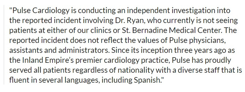 «Pulse Cardiology проводит независимое расследование данного инцидента с участием доктора Райана, который в настоящее время не принимает пациентов в любой из наших клиник или в медицинском центре Сент-Бернардино. С момента своего создания три года назад в качестве ведущего кардиологического центра, Pulse с гордостью обслуживал всех пациентов независимо от национальности с персоналом, свободно владеющим несколькими языками, включая испанский».