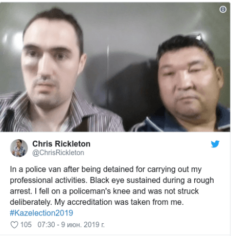 Как сообщает портал Vlast.kz, Крис Риклтон и его коллега провели два часа в РУВД, пока в дело не вмешался заместитель министра иностранных дел Роман Василенко. Он позвонил журналистам и принес свои извинения, после чего их отпустили.