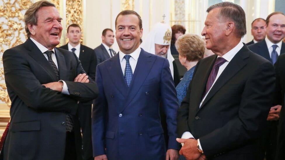 Премьер Дмитрий Медведев в компании бывшего канцлера Германии Герхарда Шредера и главы совета директоров «Газпрома» Виктора Зубкова. Медведев в хорошем настроении — уже совсем скоро станет известно, что его снова выдвинули в премьеры.