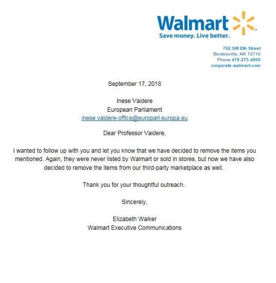 3 сентября депутаты Европарламента от Латвии, Литвы и Эстонии написали письмо в Walmart с просьбой убрать из ассортимента футболки с надписям «СССР». Текст письма опубликовала латвийский политик Кришьянис Кариньш. В своей публикации она отметила, что продажа такого товара — это неуважение к «памяти жертв, которые пострадали от рук советского тоталитарного режима».