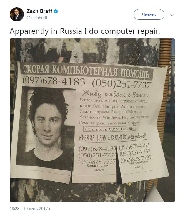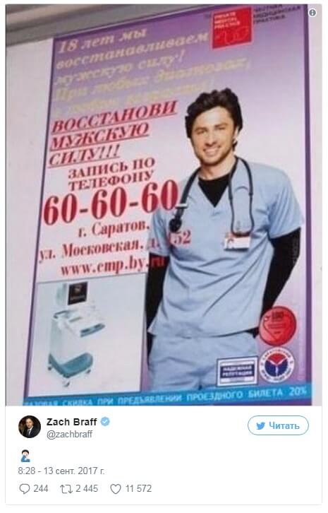 Американский актер Зак Брафф, который сыграл главную роль в сериале «Клиника», обнаружил, что в России он рекламирует средство для потенции, а также предлагает помощь в ремонте компьютеров.