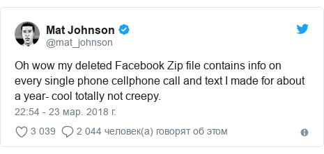 «Ооо, мой удаленный Facebook файл хранит информацию о каждом телефонном звонке и сообщении, которое я отправил примерно на протяжении года — круто же, совершенно не страшно«, — иронизирует писатель и профессор Университета Хьюстона Мэт Джонсон.