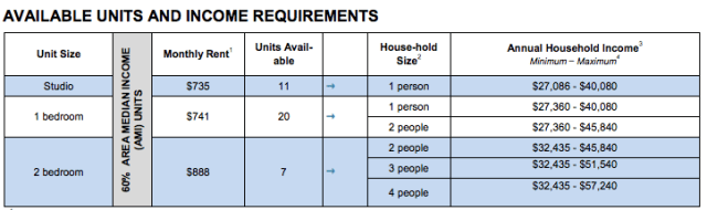 Чтобы иметь право на участие в лотерее, заявители должны зарабатывать 60% от среднего годового дохода. Годовой доход должен составлять от $27086 до $40080 для одного человека, претендующего на студию; от $27 360 до $40 080 для одного человека и от $27 360 до $45 840 для пары претендующих на квартиру с одной спальней; от $32 435 до $57 240 для семьи из двух-четырех человек, претендующих на квартиру с двумя спальнями.