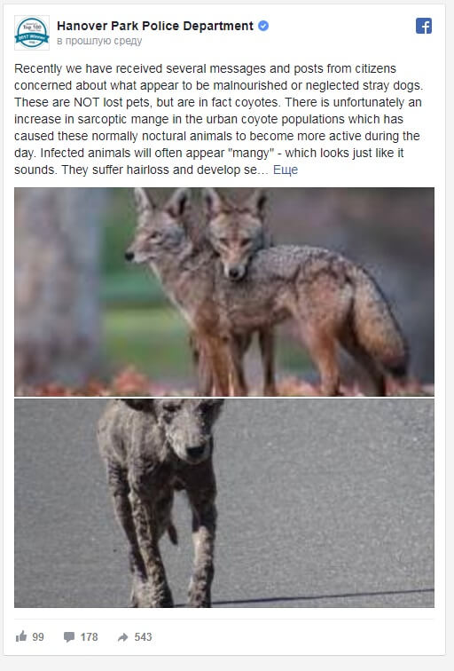 Департамент полиции Ганноверского парка на своей странице в Facebook опубликовал предупреждение, заявив, что койоты, как правило, ночные животные, заражены саркоптозом (зудневая чесотка), которое заставляет их быть активными в течение дня.