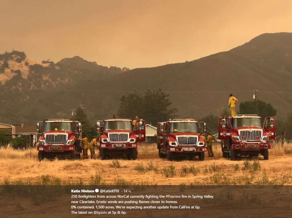 Пожар Pawnee, который стал активно распространяться в субботу возле сообщества Clearlake Oaks, уничтожил 12 зданий и поставил под угрозу исчезновения еще 600. По состоянию на воскресенье, пожар не был локализован. Местные власти издали указ об эвакуации порядка 3000 человек, проживающих в Spring Valley.