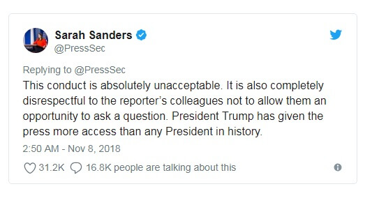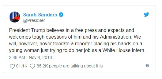 Официальный представитель президента Трампа Сара Сандерс написала в Twitter: «Белый дом не потерпит репортера, который распускает руки в отношении молодой женщины, которая лишь делала свою работу».