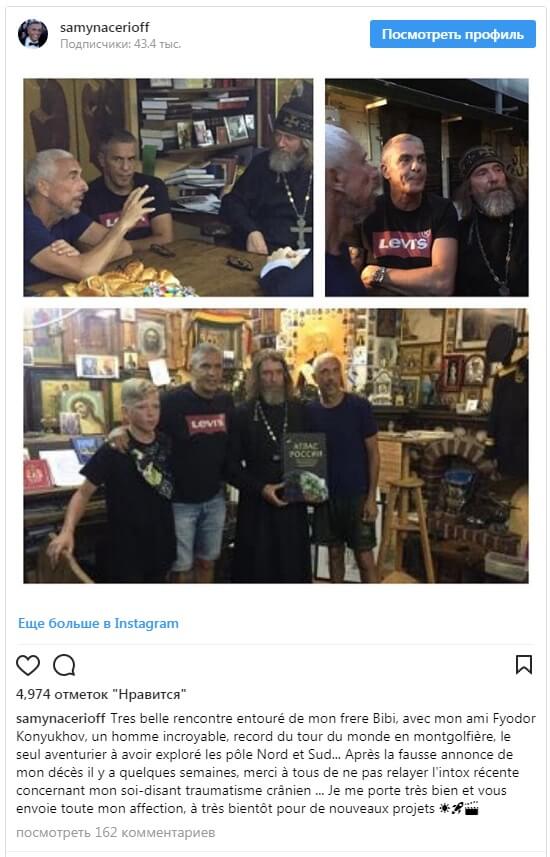 «Очень приятная встреча в окружении моего брата Биби и моего друга Федора Конюхова, невероятного человека, совершившего рекордное мировое турне на воздушном шаре, единственного авантюриста, который исследовал Северный и Южный полюсы… После ложного сообщения о моей смерти несколько недель назад, я был бы вам благодарен, если вы не будете содействовать распространению другой фейковой новости о том, что я якобы получил черепно-мозговую травму во время драки в российском караоке-баре… Я чувствую себя хорошо, желаю вам всего наилучшего», — написал актер.